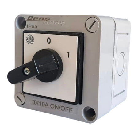 ON-OFF switch made of plastic. IP65 three-pole 0-1, ON-OFF