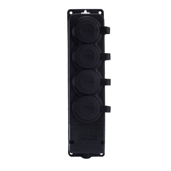 Kvaliteetne must 4 x "kummist" hermeetiline neljakandiline pistikupesa IP44 kaitsega(koos klapiga) SCHUKO maandusstandardiga, 16 amprit 250 volti, tootja Bylion