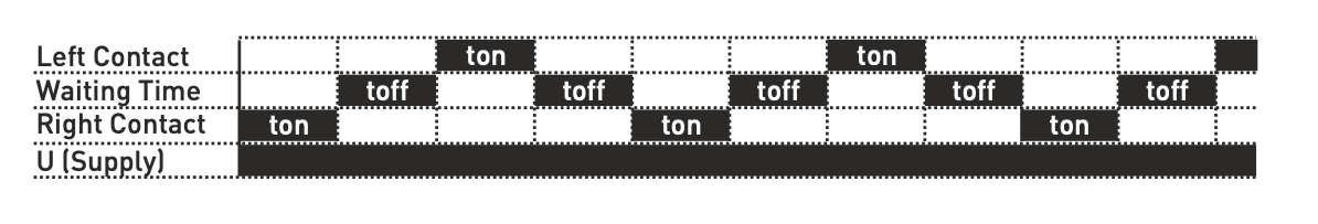 Seade on ette nähtud kahe sõltumatu koormuse tsükliliseks lülitamiseks režiimidel "vasakule - paremale", "üles - alla", "ette - tagasi" või elektrimootori vastupidise töörežiimi teostamiseks koos viivitusega lülituste vahel (nõudepesumasin ja pesumasin). Nii "Ton" kui ka "Toff" režiimide puhul saab valida aja vahemikus 0,1 sekundist kuni 100 minutini.