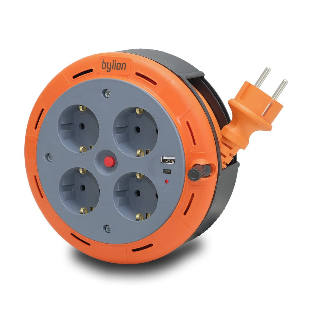 Kodumajapidamises kasutatav kompaktne pikenduskaabel, 5m, 4 pistikupesa USB ja ülekoormuskaitsega, faasi indikaator, lapse kaitselüliti, 10A230V prantsuse tüüp E (pin), 3x1mm2, IP20, Bylion